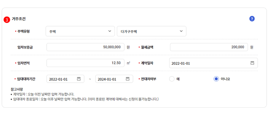- 신청정보 : 가구정보, 거주조건 정보, 거주조건 입력