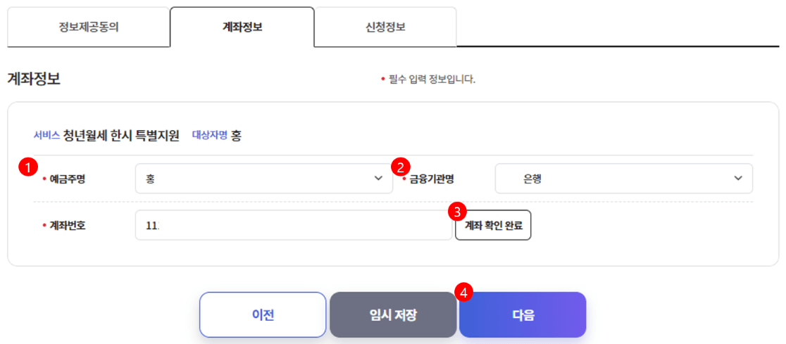 6. 두 번째 단계에서 [신청서]를 작성합니다. (정보제공동의 / 계좌정보 입력 / 신청정보 입력)
